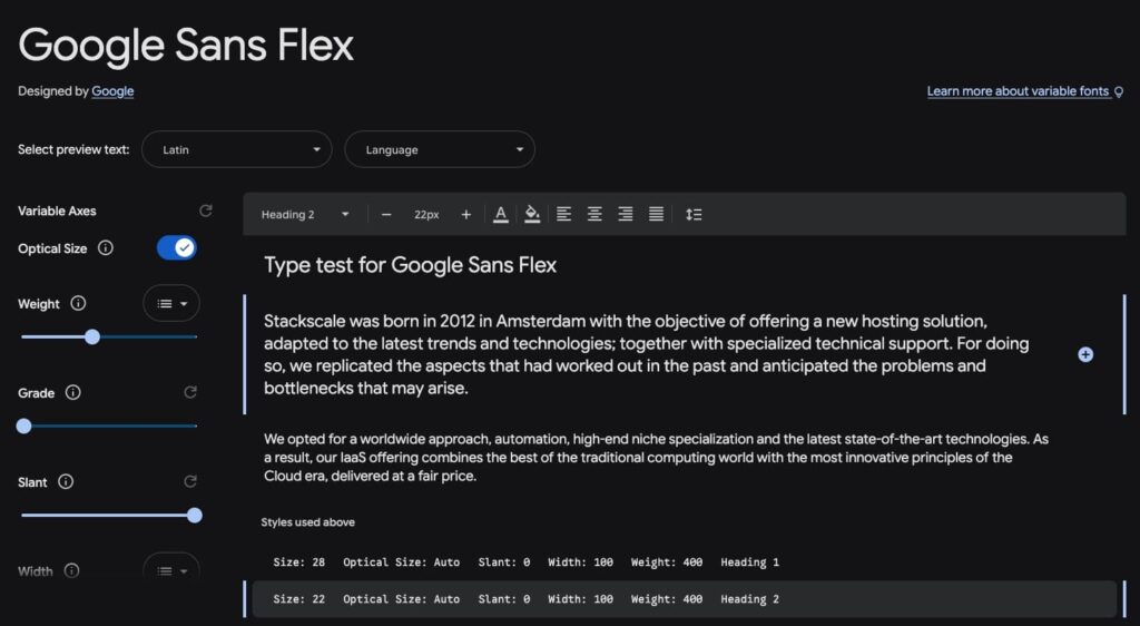 Según la documentación de Google, Sans Flex incluye cinco ejes de variación principales: