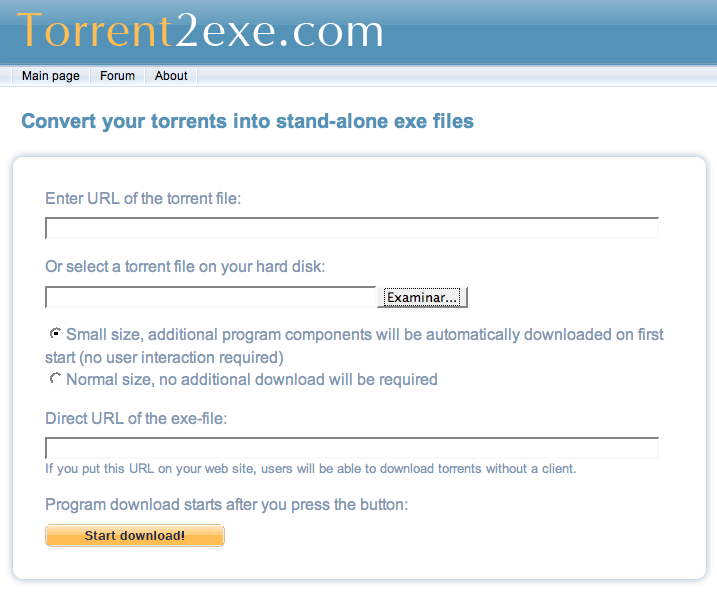 Torrent2Exe es una aplicación online que te permite descargar ficheros bittorrent sin necesidad de instalar un cliente bittorrent.Torrent2Exe convierte los ficheros torrent en ficheros ejecutables para Windows «.exe». Luego, puedes descargarlos directamente desde la web, sin necesidad de instalar ningún otro software. Funciona asÃ: